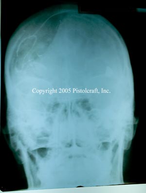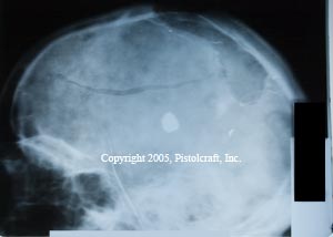 The deformation of the brain is significant, and the bullet clearly visible in the picture.